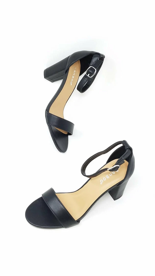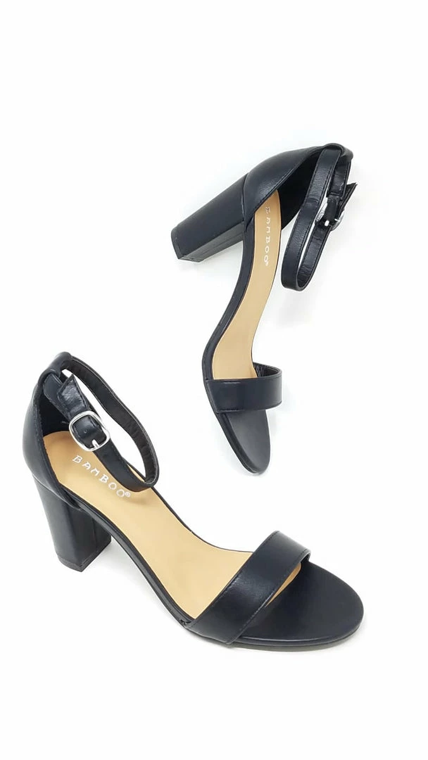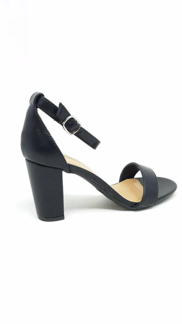 These cute, versatile heels will go perfectly with your next photo-worthy look. Chunky, open-toe, vegan suede heels feature a plain toe strap, an ankle strap with an adjustable round buckle, exposed sides, and a ridged sole. Pattern placement may vary.